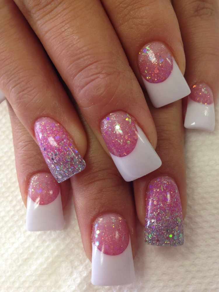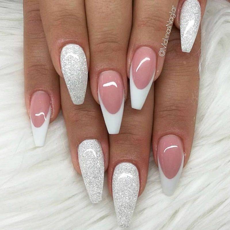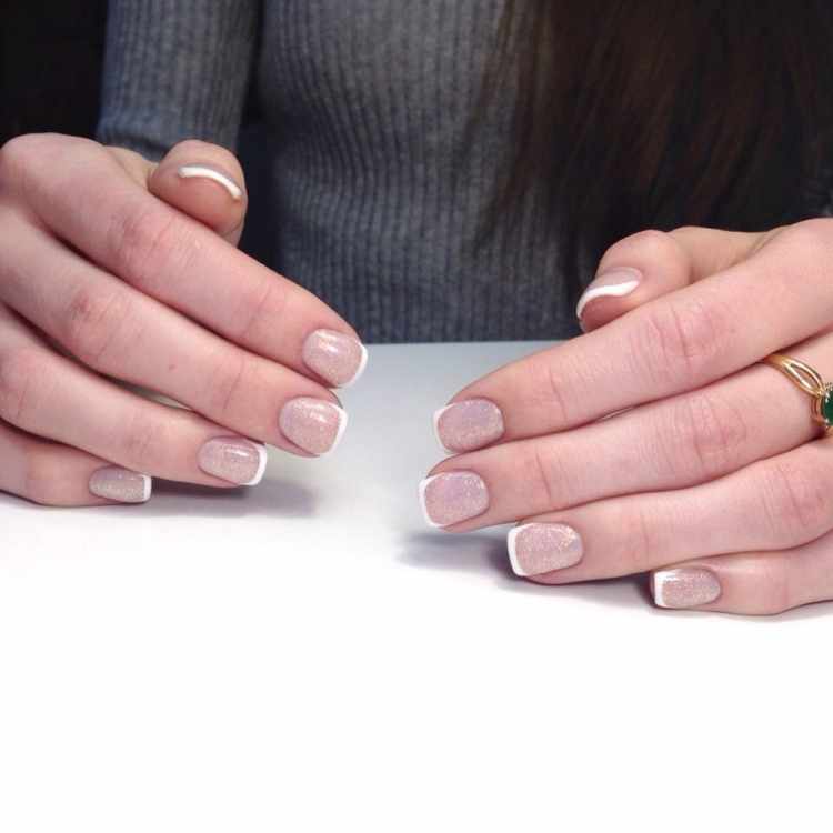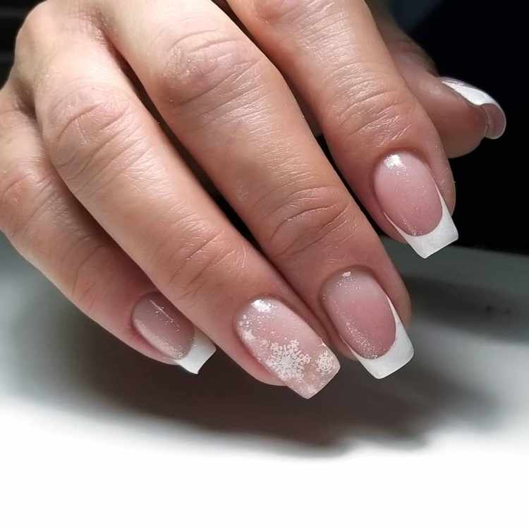 Сделайте обычный белый френч и, когда лак высохнет, покройте всю поверхность ногтя прозрачным лаком с глиттером. И просто, и необычное – самое «то» для столь классического маникюра.