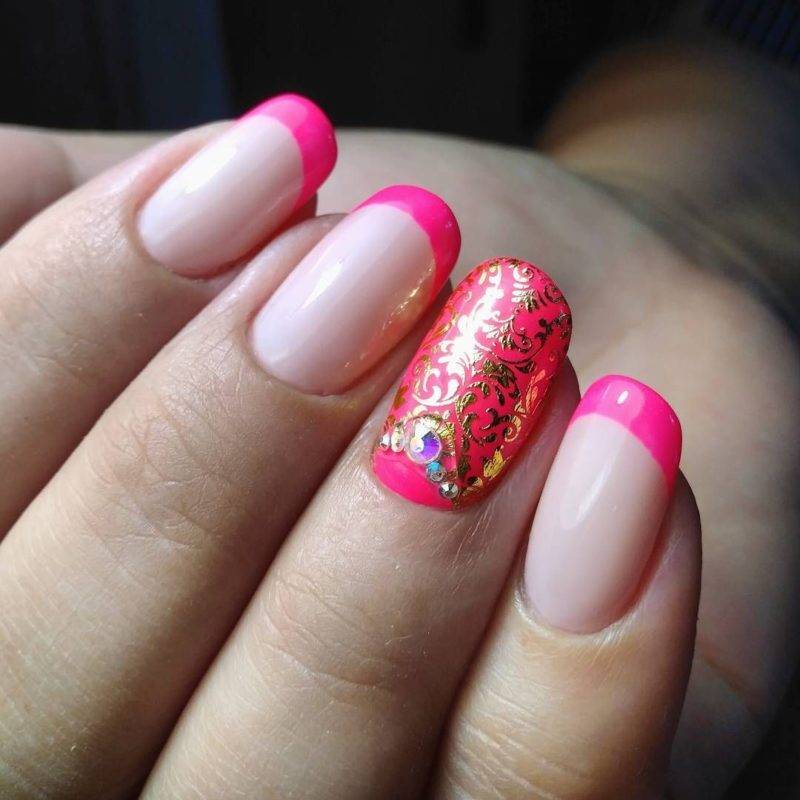 При выборе такого дизайна, как французский маникюр с оформлением свободного ногтевого края, часть пальцев можно оформить одного цвета, а по краю ногтя остальных пальцев – другого. Украшение из бусинок и камешков, сделает Ваш маникюр более необычным.