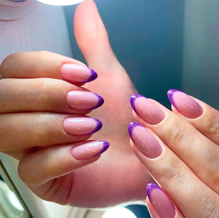 Это сочетание можно было бы назвать классическим, поскольку фиолетовый давно закрепил за собой хорошую славу. Но выбор весьма необычен. Он для тех, кто всегда полон идей. Подсказка — добавьте матовый топ, и более оригинальное трудно будет придумать. Для такого френча нет возрастных ограничений, даже несмотря на оригинальность.