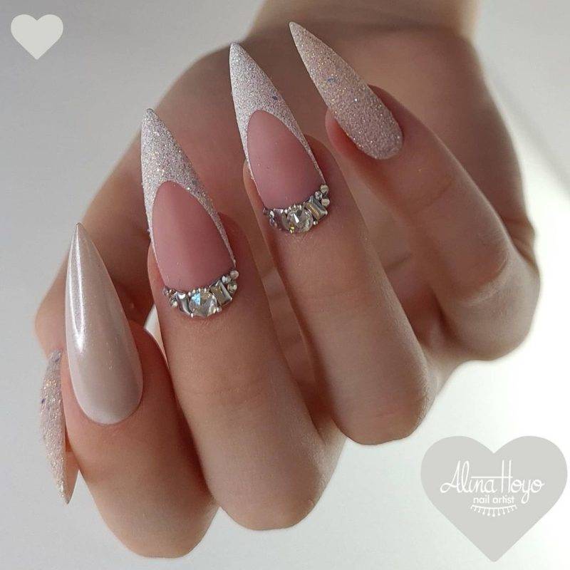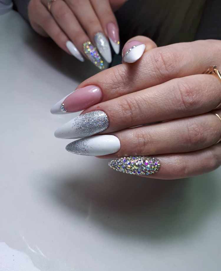 - Стразы – вполне допускаются к свадебному маникюру. Но их не должно быть слишком много. Оттенок лучше выбрать универсальный – прозрачно-серебристый.