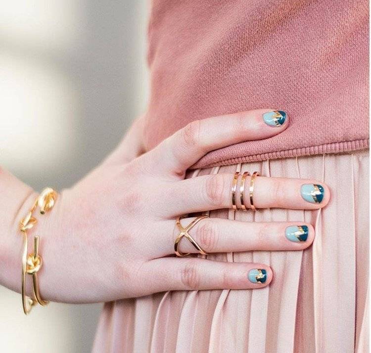 - растяжка блестками на ногтях – отлично вписывается в геометрические нейл-арты. К примеру, блестки используют для декора широкой продольной полоски посередине ногтевой пластины.