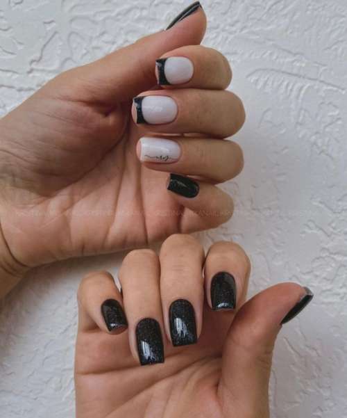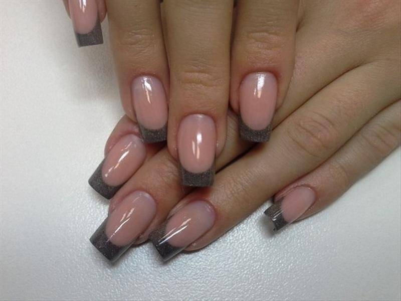 Безусловно, черный френч — достойная альтернатива белому. Единственное, темные оттенки лучше смотрятся на светлой коже — незагорелой. Поэтому этот цвет выбирают ближе к зиме. Чтобы красоту черного цвета не испортить, стоит выбрать молочное базовое покрытие.