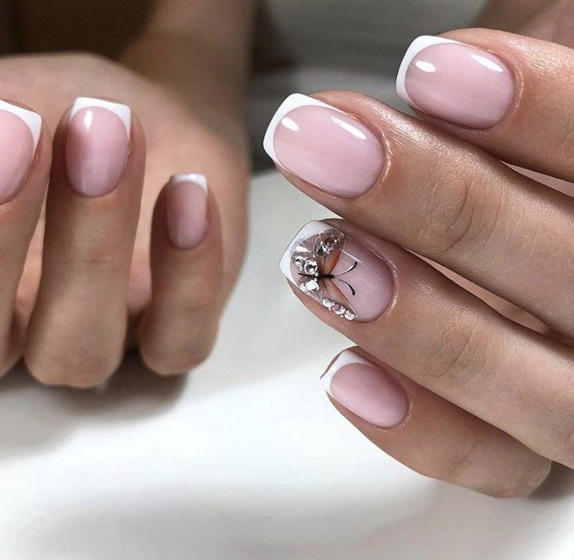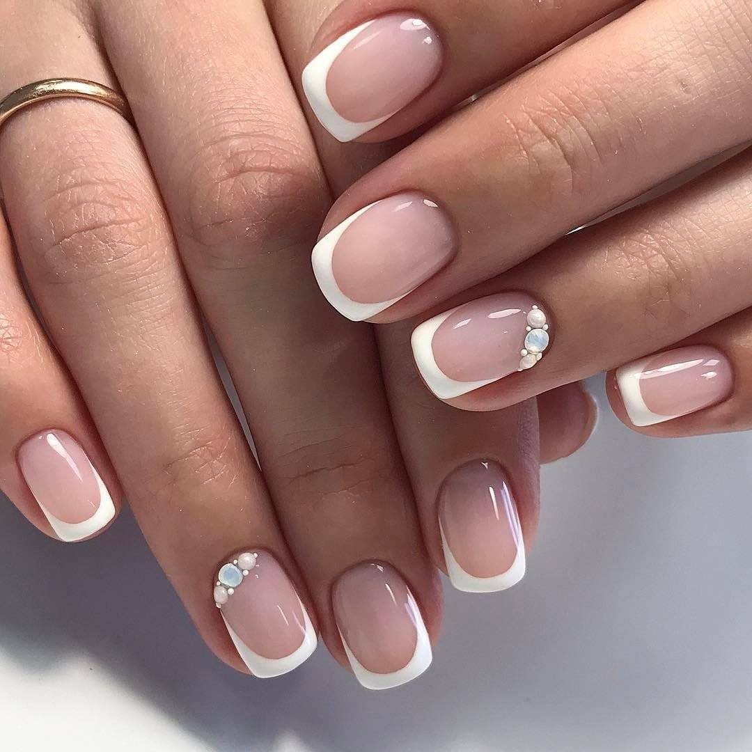 Французский маникюр с камнями может быть выполнен в любом сочетании оттенков, но особое внимание все же стоит уделить элегантному классическому варианту. Нюдовая, прозрачная, нежно-розовая или бледно-персиковая база с белоснежным кончиком сама по себе выглядит очень женственно и элегантно, а блестящие детали в виде оригинальных узоров сделают дизайн еще более изысканным в 2024 году