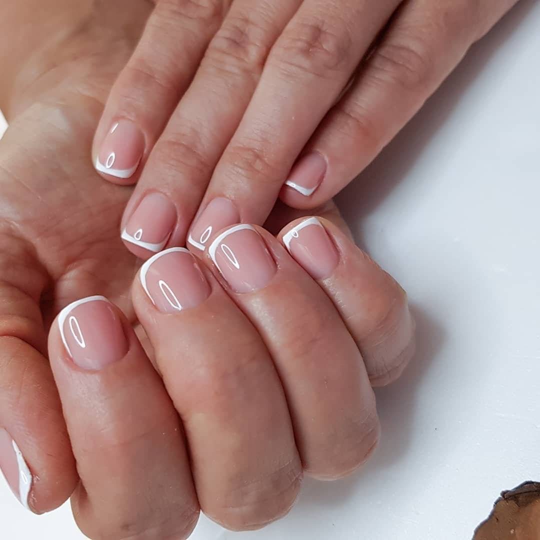 - французский маникюр — неширокая белая полоска по краю ногтя;