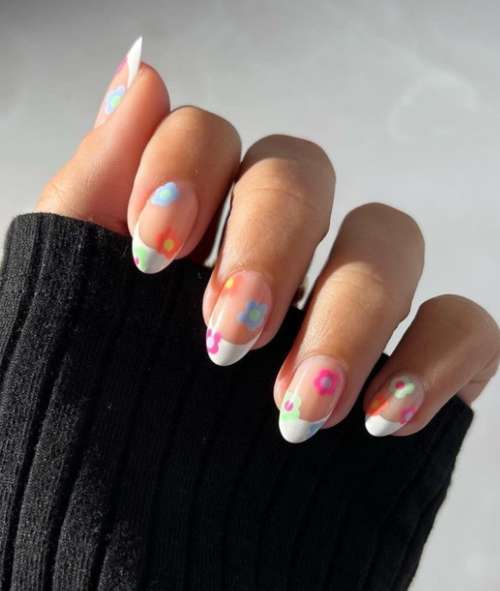 - Френч с флористическими мотивами. Этот тренд согласуется с модными расцветками одежды, особенно актуален такой нейл-арт для теплого периода года.