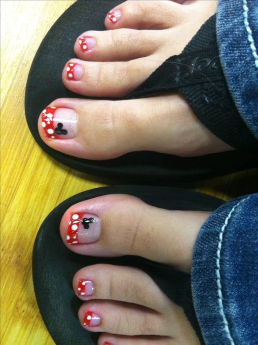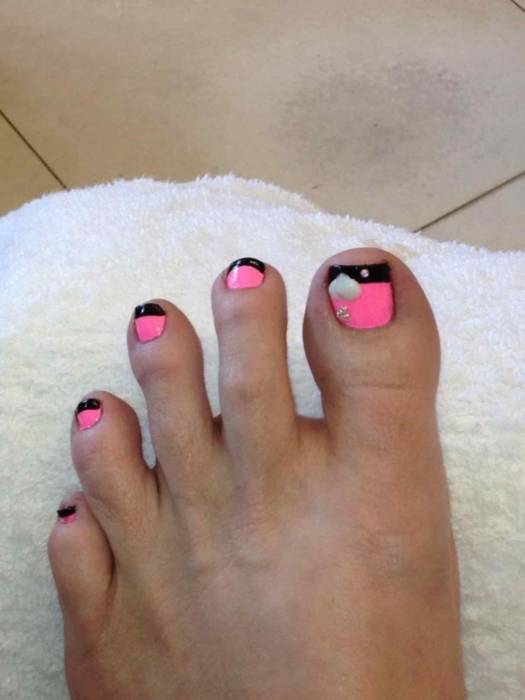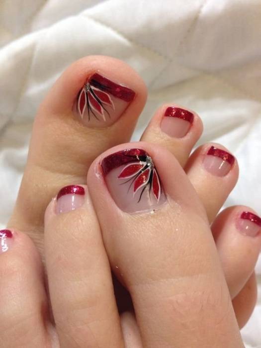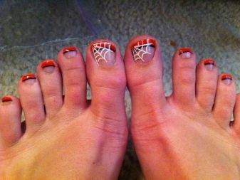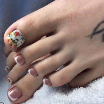 Ногтевые пластины на пальцах ног очень малы, поэтому необычный дизайн можно изобразить разве что на большом пальце. На нем закрепляют стразы. Ноготь большого пальца расписывают цветными лаками. Мастера с интересом берутся за изображение ажурных рисунков, пытаются добавлять блестки и экспериментировать с фактурами.