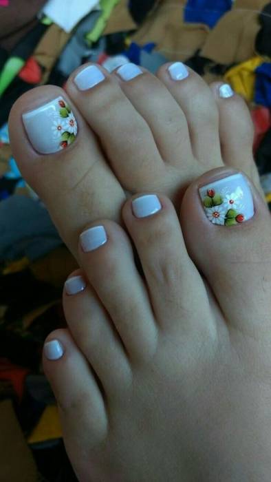 Украшать педикюр крупными и объемными композициями – непрактично. Однако плоские рисунки с изображением растительных сюжетов вполне подходят для такого вида дизайна. В педикюре все должно быть достаточно просто, так как пестрые и сложные силуэты на ногтях ног сливаются из-за невозможности их рассмотреть.