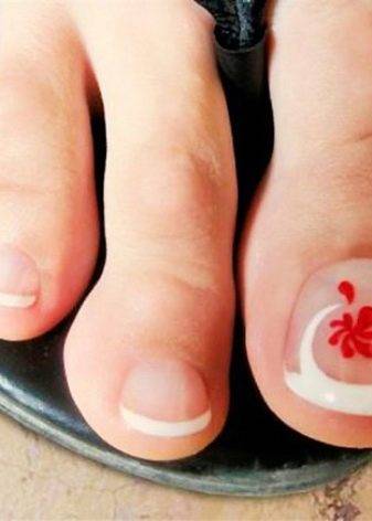 Френч на ногах очень похож на французский маникюр, основная разница лишь в том, что этот характерный стиль украшения ногтей используется на ногах, а не на руках. Такой педикюр отличается тем, что состоит из двух цветов. Первым слоем наносится нейтральный телесный цвет, близкий к персиковому. Этим лаком нужно покрыть весь ноготь. Вторым цветом наносят белоснежный оттенок – тонкой линией у края ногтя. Эта линия отличает французский маникюр или педикюр от других стилей. Обычно красят только кончик ногтя, который чуть выступает за подушечку пальца, потому толщина белой полоски зависеть от длины ногтя.