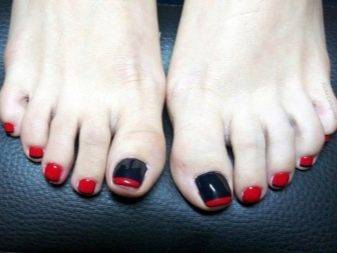 Особым шиком считается френч педикюр из ещё двух классических цветов: красного и чёрного. Такое сочетание сделает ваш образ загадочным и даже роковым. Окантовка двумя этими цветами на прозрачной основе придаст изюминку вашему педикюру. Если такая окантовка вас не устраивает, обыграйте эти цвета в стразах: чёрные и красные стразы можно выложить дугообразно или «рассыпать» по ногтевой пластине большого пальца.