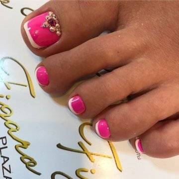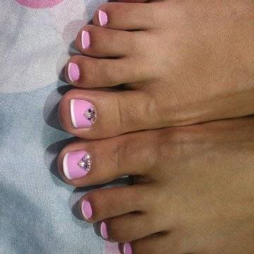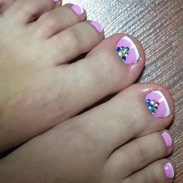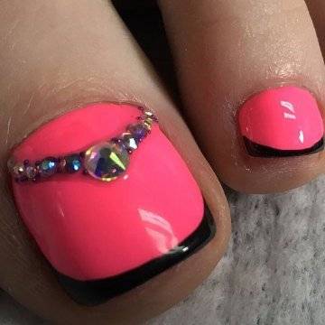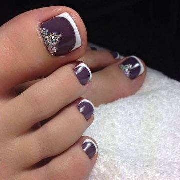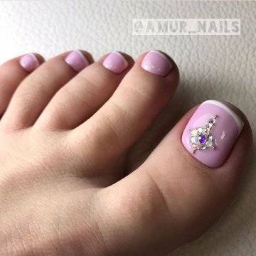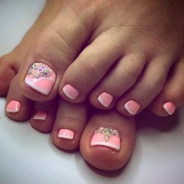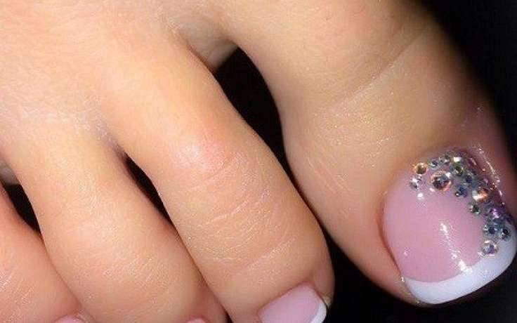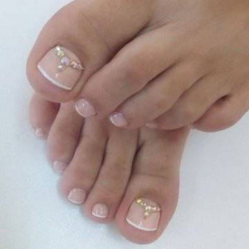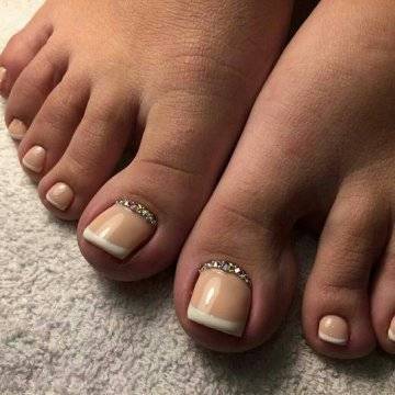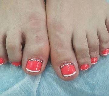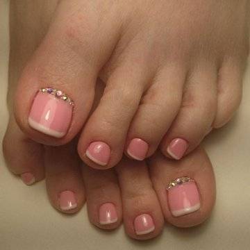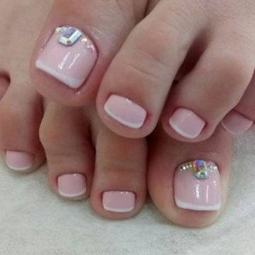 - френчевый педикюр со стразами – на основное цветное покрытие ногтя (оттенки могут самым разнообразными) выкладывается пирамидка у его прикорневой зоны в виде нескольких рядов камней, постепенно уменьшающих своё количество по мере роста ногтевой пластины; такой вариант довольно эстетичен и, в то же время, наряден – при нужном торжественном или повседневном варианте можно поиграть с более яркими или относительно спокойными приглушёнными цветами основы;
