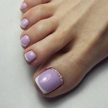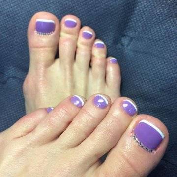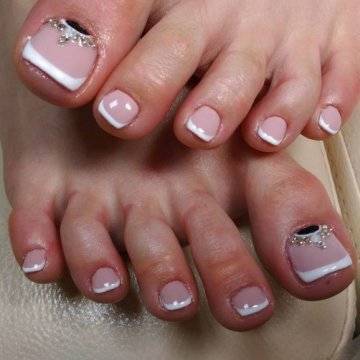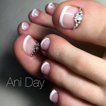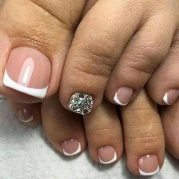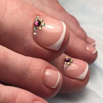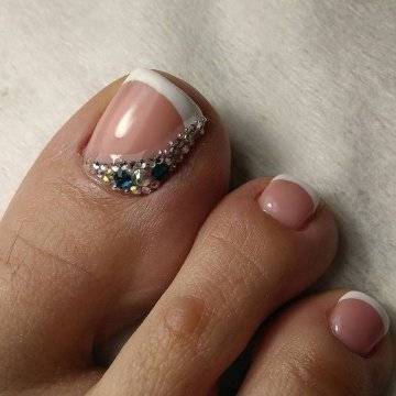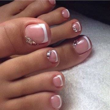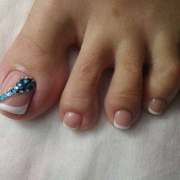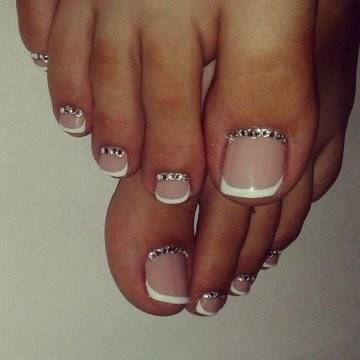Даже такой универсальный вид педикюра можно сделать эксклюзивным. Очень нарядно смотрится френч на ногах со стразами. Можно использовать не только белый лак для кончиков, а любые желаемые цвета. Ноготки можно украсить нарисованным кружевом. В общем, это огромное поле для фантазии.