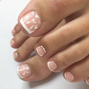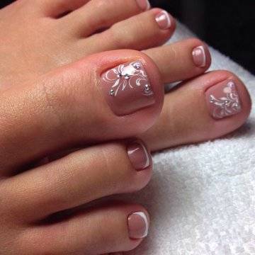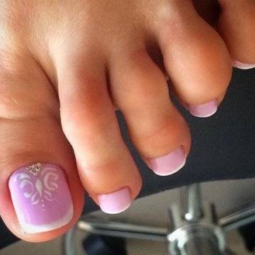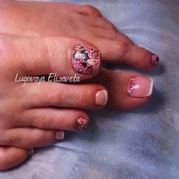 - френч с рисунком – самый часто используемый вариант, предполагающий изображение цветов, бабочек, абстракций, геометрических линий и прочей всячины на большом ногте ноги в совмещении с выдержанной в одной тональности с декором французской улыбкой;