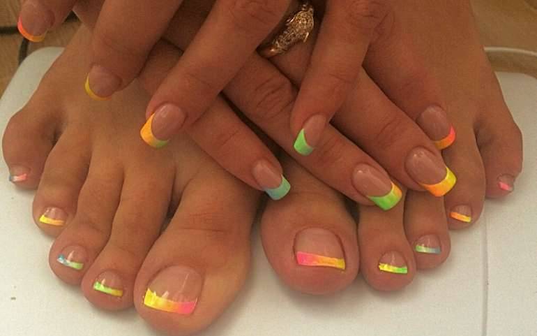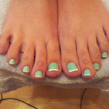 - цветной педикюр в стилистике френч – сейчас очень модно играть с цветами, особенно в летний период года, когда, собственно, ножки и открываются на всеобщее обозрение. Актуально покрывать основу мятным оттенком и оттенять его улыбкой френча в малиновой тональности, или компоновать в таком же стиле жёлтый тон с оранжевым, белый с красным, голубой с цветом электрик и т.д. Смотрятся такие композиции на ноготках ножек достаточно живописно и радужно;
