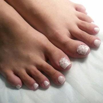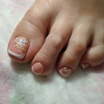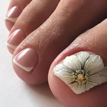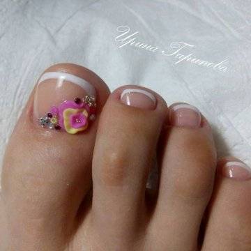 - лепка с сочетании с французом – широкая площадь ногтевой пластины большого пальца ноги позволяет разместить на ней разные идеи объёмной выкладки, чем и пользуются мастера художественного декорирования. Они воссоздают на ногтях от нежного белого папоротника до объёмных широких крыльев цветных бабочек из акрилового твёрдого состава – эффект всегда поражает техникой художественного перевоплощения искусственного материала в невероятно натуральный эскиз;