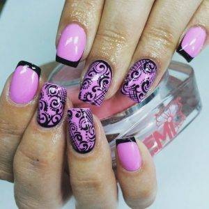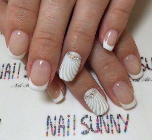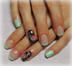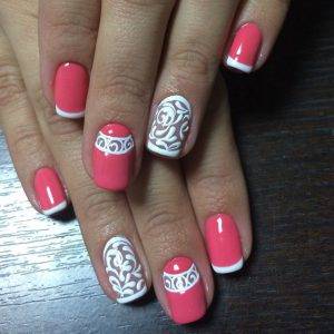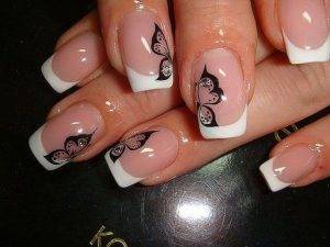 Они различаются по форме, исполнению и цветам. Существует несколько видов: классический, ассиметричный, с разными линиями улыбки. Всё зависит от формы ногтей, техники нанесения, дополнительных украшений, стилистики.