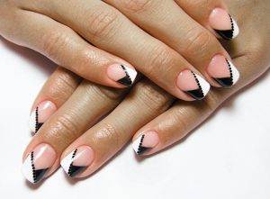 Треугольный достигается при помощи трафаретов, липких лент, красок, дотса. Напоминает треугольник, остальное пространство закрашивается. Красиво сочетается с одним или двумя цветами. Зрительно делает ногти более длинными и острыми.