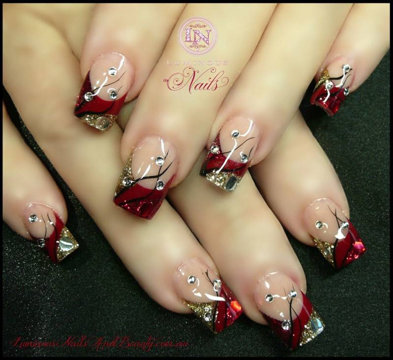 Легкие блестки уже давно стали известной деталью в любом нейл-арте. При сочетании этого элемента с красно-черным французским маникюром можно придать ему торжественность и яркость. В этом случае стоит использовать блестки как красного, так и черного цвета, дополняя линию улыбки или создавая красивые узоры. Модной новинкой стала замена цветов краски соответствующими блестками. Такой дизайн выглядит очень утонченно и неотразимо. Альтернативным вариантом стало использование классических золотистых блесток.