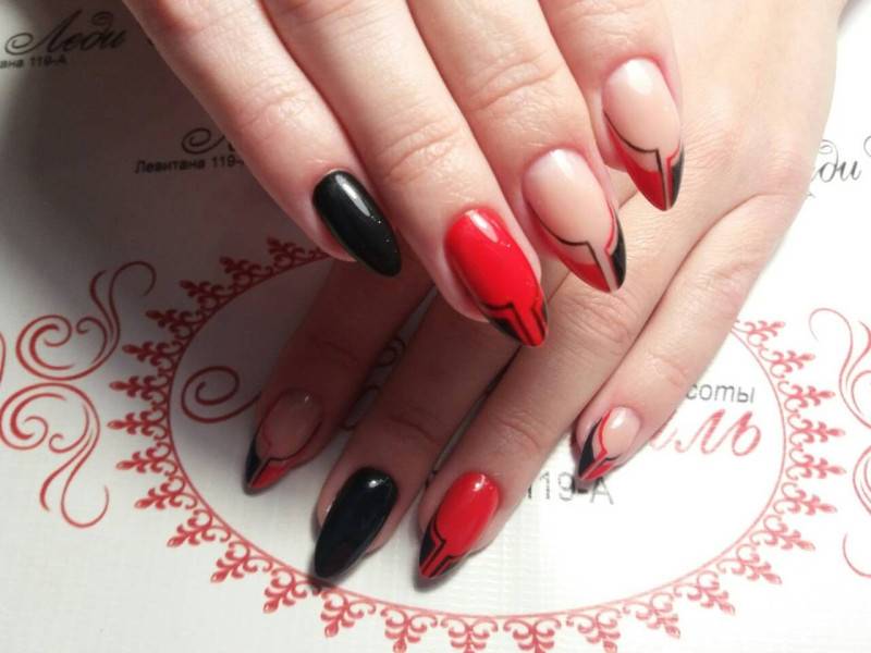 Восхитительный и утонченный красно-черный французский маникюр требует особого дополнения. Таким элементом могут стать рисунки. Для этого цветового сочетания тонко подходят геометрические мотивы разной формы. Мастера нейл-арта предлагают делать линии на красном тоне черным цветом. Для романтичных и нежных девушек подойдут цветочные и цветочные мотивы, способные дополнить образ легкостью и мечтательностью. Для выполнения строгого офисного дизайна используется геометрия. А для более замысловатого эффекта можно изобразить световые узоры.
