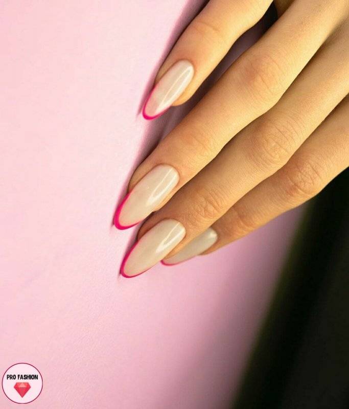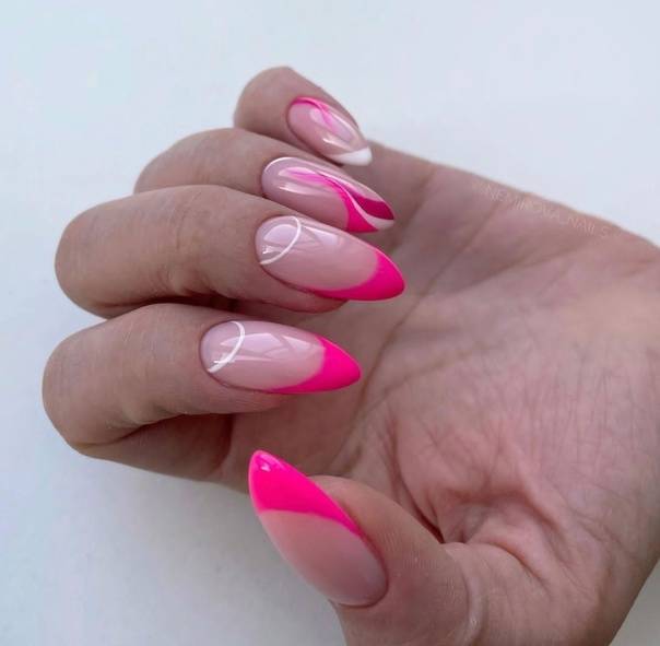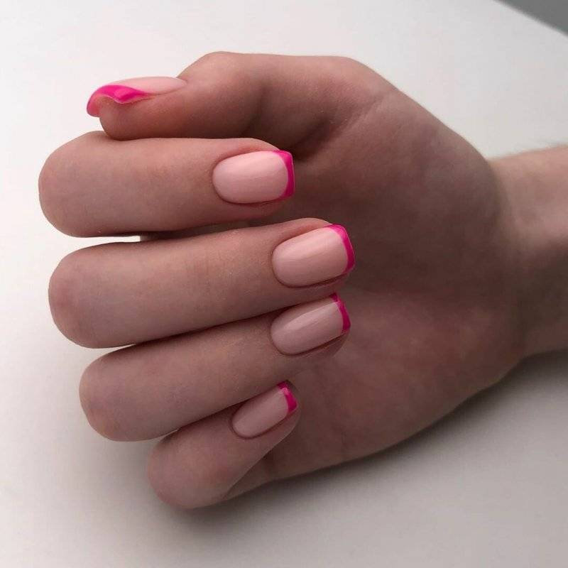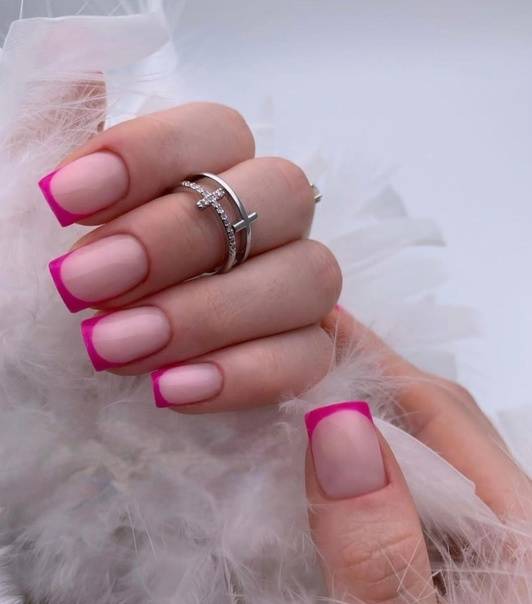 Ярко-розовый френч обладает акцентным дизайном, который отлично будет смотреться на ногтях девушки, которая хочет добавить красок в свою жизнь. Выделяемый оттенок хорошо сочетается с мягким квадратом, а если хотите добавить образу изюминки, стоит сделать миндалевидные ногти.