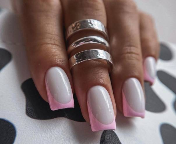 Нежно-розовый френч — это сочетание универсальности и стиля, который подойдёт на ногти любой длины и формы. Особенно утонченно французский маникюр будет выглядеть на миндалевидных ногтях, добавляя шарма и романтики, а вот квадратный вариант смотрится строже и лаконичнее.