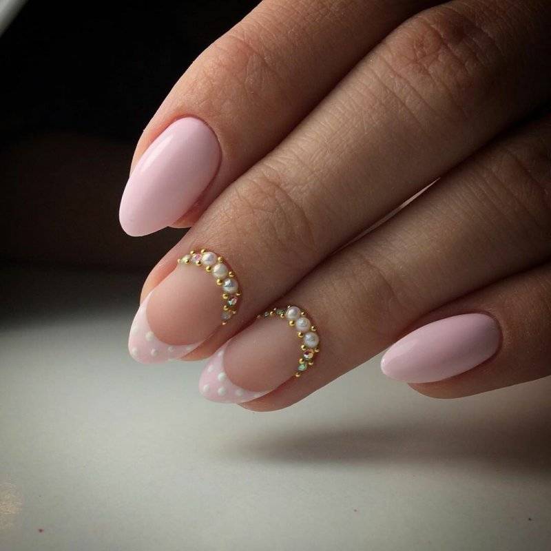 Кайму на миндале лучше выполнять в классическом виде, зато сами ногтевые пластины разрешается покрывать матовым и глянцевым лаком, наносить любые рисунки и применять разнообразный декор.