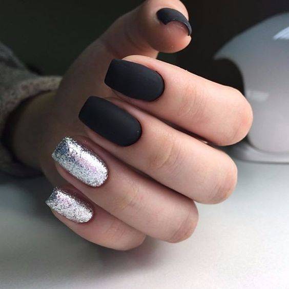 Блестящий элемент великолепно смотрится на чёрном. Чаще, это праздничный вариант, который подбирают в соответствии с костюмом. Но результат напрямую зависит от качества и особенностей глиттера, что позволяет использовать технику на каждый день.