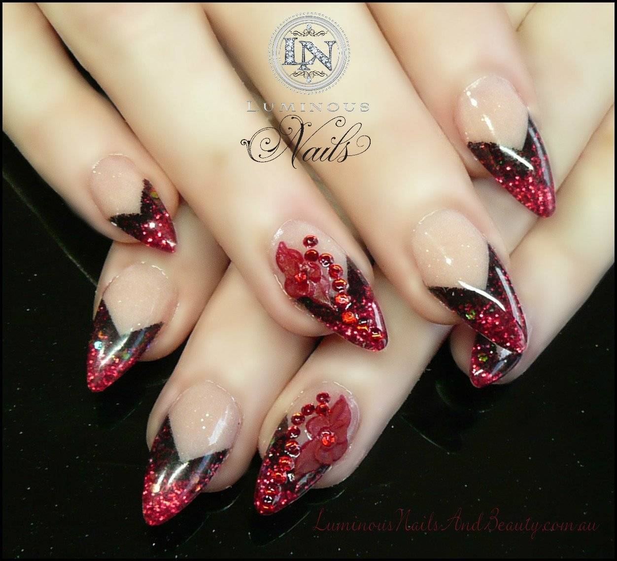 Легкие блестки уже давно стали известной деталью в любом нейл-арте. При сочетании этого элемента с красно-черным французским маникюром можно придать ему торжественность и яркость. В этом случае стоит использовать блестки как красного, так и черного цвета, дополняя линию улыбки или создавая красивые узоры. Модной новинкой стала замена цветов краски соответствующими блестками. Такой дизайн выглядит очень утонченно и неотразимо. Альтернативным вариантом стало использование классических золотистых блесток.