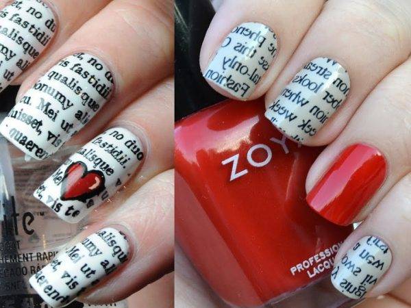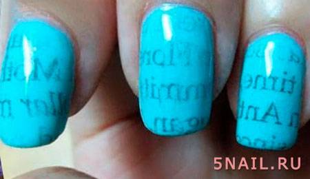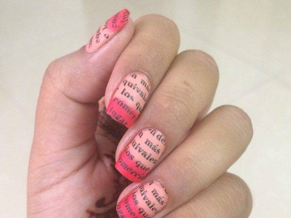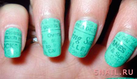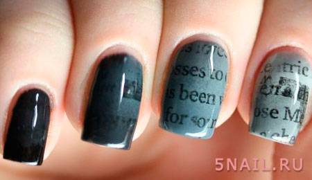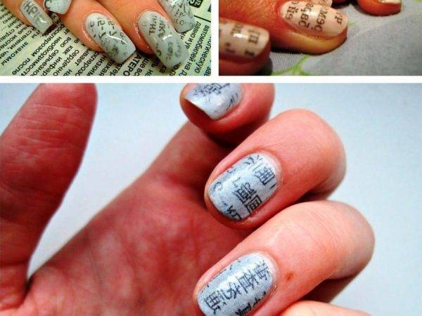 - Наносной маникюр – лоскутки газеты покрывают прозрачным лаком. Такой дизайн продержится дольше.