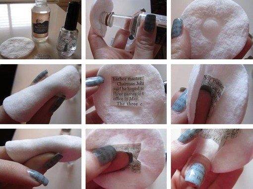 Маникюр с газетой не всегда получается идеальный. Стоит следить, чтобы бумага при нанесении на ногтевую пластину не порвалась, иначе буквы будут размытыми. Если такое случилось, ватный диск смачивают в спирте и удаляют неудачное изображение.