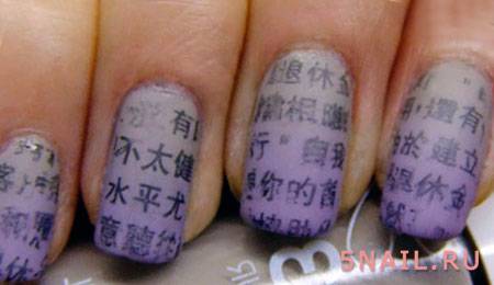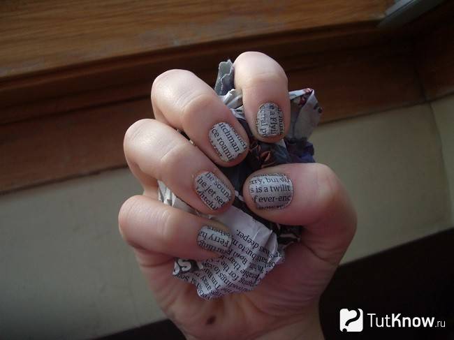 Некоторые дамы предпочитают совершенную экзотику и просто приклеивают газетные кусочки на ногти, покрывая их закрепляющим бесцветным лаком. Это, скорее всего, самый простой способ, но вредный для ногтей.