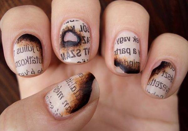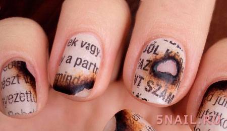 Оригинально смотрится рисунок обожженной газеты. Чтобы его выполнить, сначала наносят светлый лак. Дают высохнуть. Потом окунают в спирт бумажный лоскуток. Извлекают и прижимают к ногтю. Выдерживают 30 сек. После того как отпечаток высохнет, наносят прозрачный лак. Дальше с помощью спонжа для маникюра отдельные участки ногтевых пластин покрывают лаком коричневого цвета. Ватную палочку смачивают в средстве для снятия лака и имитируют ею обожженные лоскутки. Сверху наносят закрепитель.