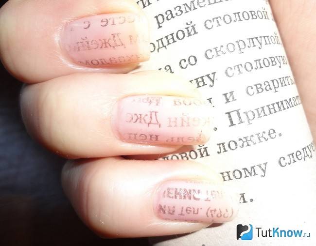 После того, как вы приложили проспиртованную газету к ногтевой пластине, поприжимайте ее пальцами по всей поверхности ногтя, чтобы текст равномерно отпечатался, и подержите по несколько секунд. Следите, чтобы газета не смещалась, иначе текст отпечатается несколько раз или размажется.