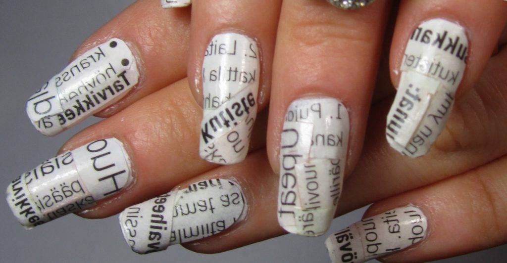 Некоторые дамы предпочитают совершенную экзотику и просто приклеивают газетные кусочки на ногти, покрывая их закрепляющим бесцветным лаком. Это, скорее всего, самый простой способ, но вредный для ногтей.
