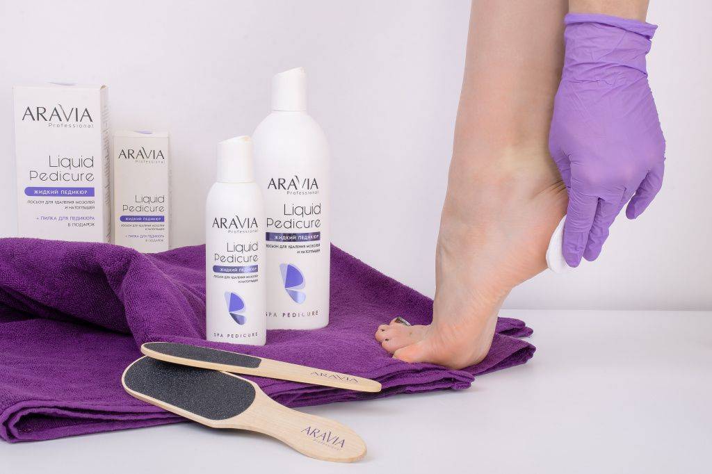 Щелочные кератолитики действуют довольно активно, поэтому использовать их следует осторожно и отдавать предпочтение проверенным производителям. Лосьон для удаления мозолей и натоптышей «Жидкий педикюр» от ARAVIA Professional — средство, которое максимально быстро справляется с проблемами стоп, возвращая коже гладкость, мягкость и ухоженный вид