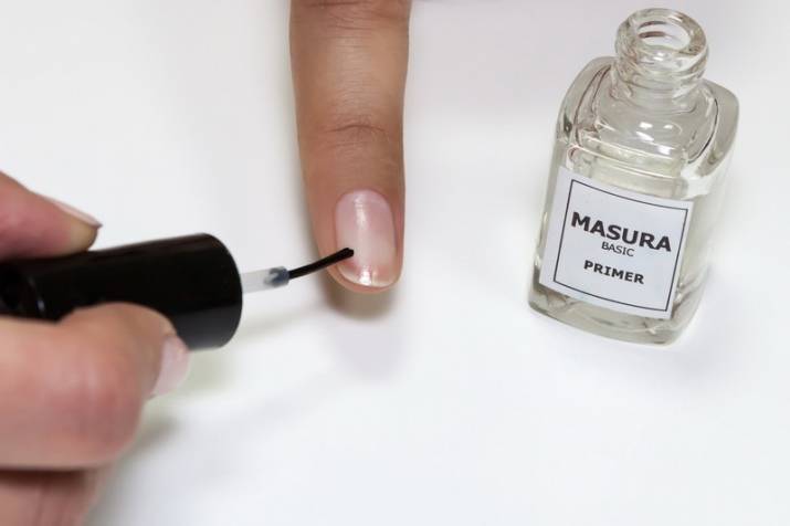 На втором этапе наносится специальный праймер, который служит более надежному сцеплению лака с поверхностью ногтя. Праймер безопасен для ногтевой пластины и выступает в качестве своеобразной грунтовки, укрепляющей слабые ногти. Он используется и для обработки торца ногтевой пластины.