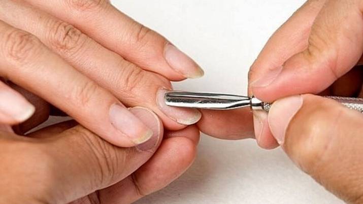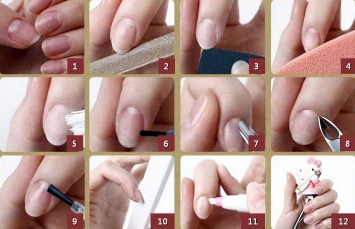 Первый этап подготовки к процедуре вполне традиционен. Нужно аккуратно отодвинуть кутикулу, удалить лишнюю кожу, очистить поверхность ногтевой пластины от следов грязи и жира. Если ноготь расслоился, его необходимо бережно подровнять пилочкой. При этом необходимо избегать мокрого маникюра, поскольку впитавшаяся влага в дальнейшем приведет к появлению вздутий на поверхности лакового покрытия.