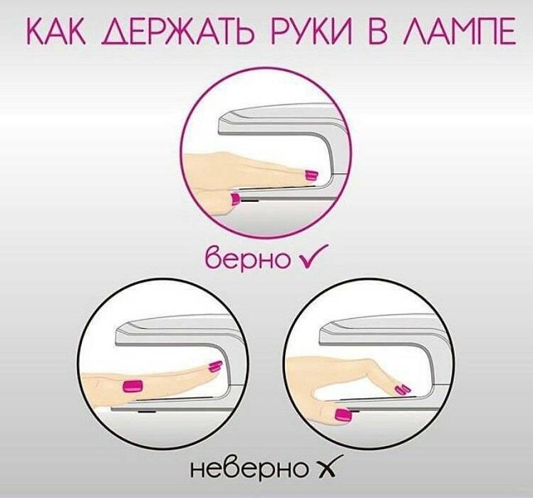 Пальцы не прижимают друг к другу, рука должна быть расслаблена. Все положенное для полимеризации время кисть нельзя вынимать из «печки». Иначе процесс нарушится, покрытие просохнет неравномерно, отчего потом появляются отслойки. Сушить ногти больших пальцев с гель-лаком в лампе следует отдельно. Руку помещают внутрь так, чтобы пластина была параллельна столешнице. Нельзя заваливать большой палец на бок, это тоже чревато появлением затеков и некачественной полимеризацией.