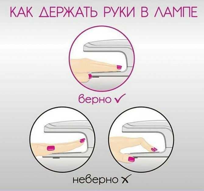 Сушить ногти больших пальцев с гель-лаком в лампе следует отдельно. Руку помещают внутрь так, чтобы пластина была параллельна столешнице. Нельзя заваливать большой палец на бок, это тоже чревато появлением затеков и некачественной полимеризацией.