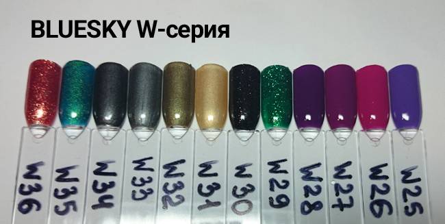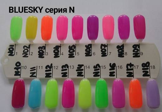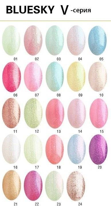 В целом все коллекции гель-лаков Bluesky насчитывают более 600 оттенков. Среди них можно найти покрытие любой фактуры, различные эффекты, наличие в гель-лаке мелких и крупных блесток, перламутровые вариации, эффект неонового покрытия, эффект «металлик», «кошачий глаз» и многое другое.