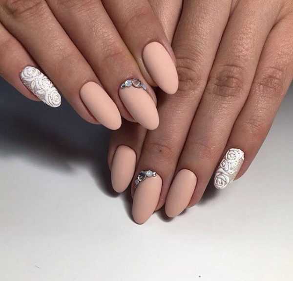 Приветствуется использование в дизайне нюдового маникюра акцентные украшения: стразы, пайетки, бусинки, камушки. Форма ногтей практически не поменялась с прошедшего года, только края ногтевых пластинок рекомендуется слегка, мягко округлить.