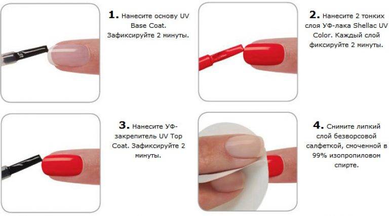 Соблюдая правила нанесения шеллака, можно сделать качественный, красивый маникюр. Предварительно следует подготовить ногтевую пластину: смягчить и отодвинуть кутикулу, отшлифовать ногти пилкой для выравнивания поверхности и лучшего сцепления. Чтобы шеллак держался хорошо, рекомендуется обработать пластины обезжиривающим средством. Далее накладывается база, которая фиксируется в УФ-лампе, потом основной цветной слой, при необходимости узор или второй слой, финишное покрытие. После каждого из них ногти подсушиваются. Финальное действие – снятие липкости.