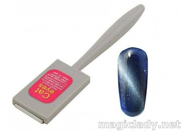 Маникюр «кошачий глаз» традиционно выполняется при помощи специального магнита. Именно он обеспечивает оригинальный узор и распределение металлических частичек материала по ногтевой пластине.