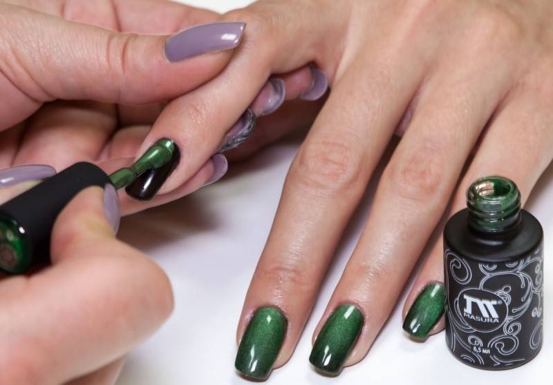 Сначала ноготки покрывают основой (базой) для гель-лака, которую просушивают в ультрафиолетовой лампе. Затем наносят зеленый гель-лак, который тоже сушат. Магнит подносить сразу не нужно. В видео мастер этот момент описывает. На фото показан прекрасный, глубокий изумрудный оттенок, который очень похож на кошачий глаз.