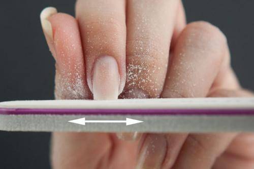 Зафиксируйте руку со спиливаемыми ногтями так, чтобы пальцы оставались неподвижными, а работала только пилка в другой руке. Пилку следует держать плашмя, удаляя слой за слоем. Удаляйте пыль, чтобы видеть обрабатываемую поверхность.