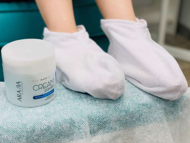 Для его плавления используют специальные парафиновые ванночки, которые поддерживают нужную температуру, которая будет комфортна для процедуры и предотвратит появление ожогов. После того, как масса остывает до 50 градусов, в нее несколько раз погружают ноги, формируя на стопах слой парафина.