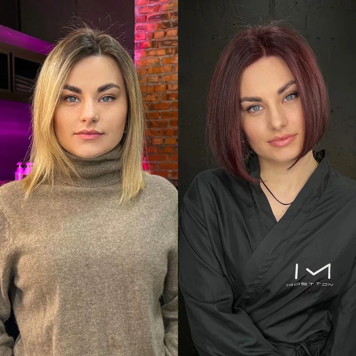 - Откажитесь от ярких, броских тонов при окрашивании волос, в том числе «баклажан», «бордо», используйте максимально натуральные оттенки.