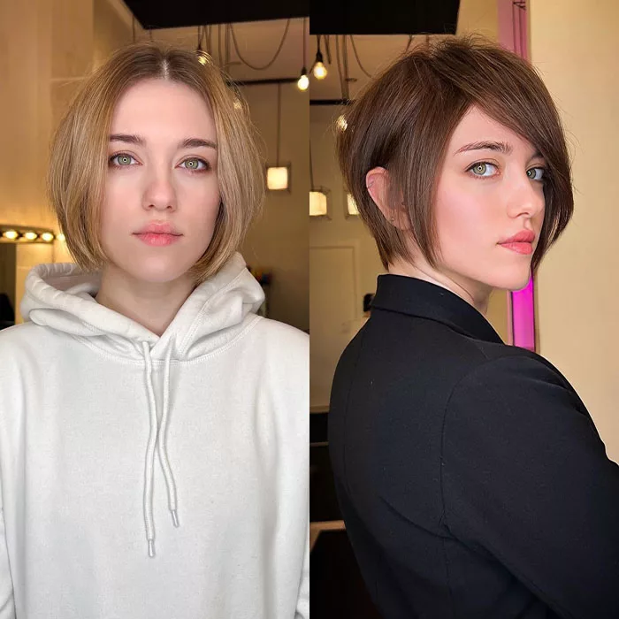 Боб-пикси — это смесь между пикси-стрижкой и бобом, создавая элегантный и свежий вид. Эта стрижка также может создать объем в верхней части головы, делая ее более современной и элегантной.
