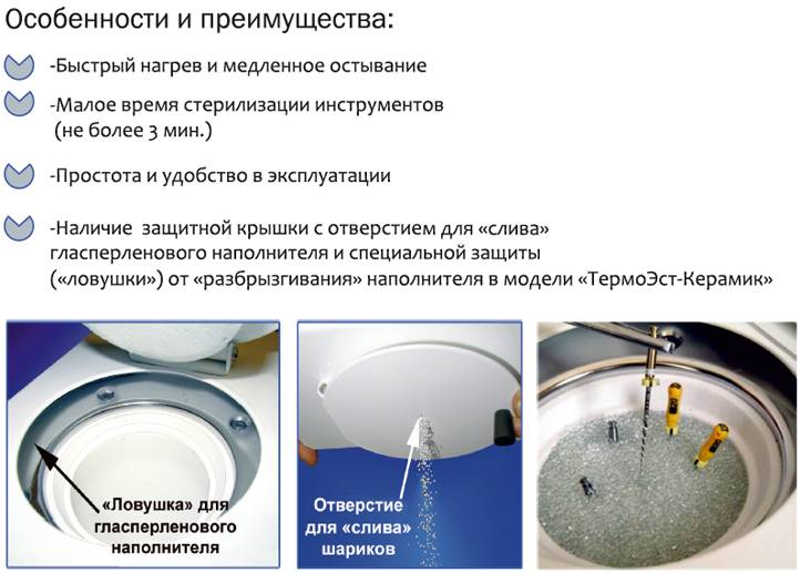 Жаропрочная емкость окружена нагревательным спиралевидным элементом, с которого задаваемая температура передается на стеклянный наполнитель. Раскаленные шарики контактируют с поверхностью инструментария и осуществляют его стерилизацию.