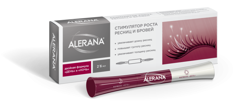 Стимулятор роста Alerana, производитель фармацевтическая компания Вертекс, Россия. В футляре 2 стороны – для дневного и ночного применения. Дневной состав более легкий – пантенол, экстракты каштана, элеутерококка и крапивы, таурин. Ночной включает комплекс масел и витаминов. Цена – около 550 руб.