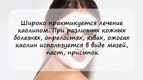 Каолин подсушивает, устраняет жирный блеск и сужает поры. Подходит для регулярного применения, маску из этого вещества можно применять в любом возрасте. Вещество нормализуется обменные процессы в эпидермисе, поэтому подходит и для профилактики повышенной жирности. Снижает риск развития угревой сыпи, прыщей и комедонов.